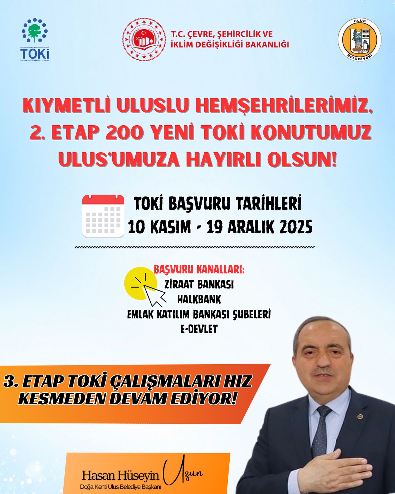 Başvurular, Ziraat Bankası, Halkbank, Emlak Katılım Bankası şubeleri ile E-Devlet üzerinden gerçekleştirilebilecek. Başkan Uzun, ayrıca 3. etap TOKİ çalışmalarının hız kesmeden devam ettiğini belirtti.
