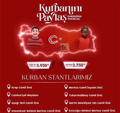 Bartın Müftülüğü ve Türkiye Diyanet Vakfı Bartın Şubesi işbirliği ile yaklaşan Kurban bayramı öncesi vatandaşların kurban bağışlarını kolaylıkla yapabilmeleri için 8 önemli noktaya vekâletle kurban bağış stantları kuruldu. Bu bağlamda Arap Camii önü, Bartın Cumhuriyet Meydanı, Aşağı Yeni (Şadırvan) Camii önü, Bartın Merkez Camii İnşaatı önü, Yukarı Halilbey Camii önü, Yalı Camii önü, Kozcağız Merkez Camii önü ve Hasankadı Merkez Camii önü kurban stantları kuruldu.