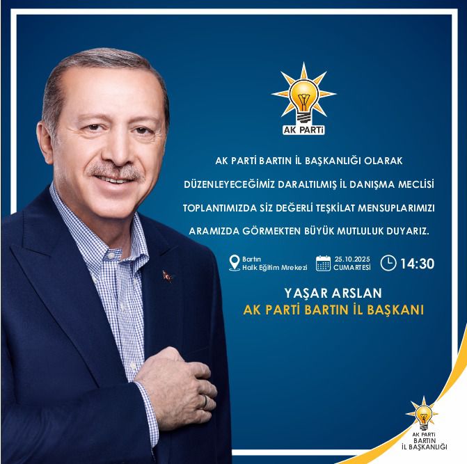 AK Parti Bartın İl Başkanlığı, teşkilat çalışmalarının değerlendirilmesi ve yerel yönetim gündemlerinin ele alınacağı Ekim Ayı Aylık Olağan Daraltılmış İl Danışma Meclisi Toplantısını yarın (25 Ekim 2025 Cumartesi) saat 14.30’da Bartın Halk Eğitim Merkezi’nde gerçekleştirecek.