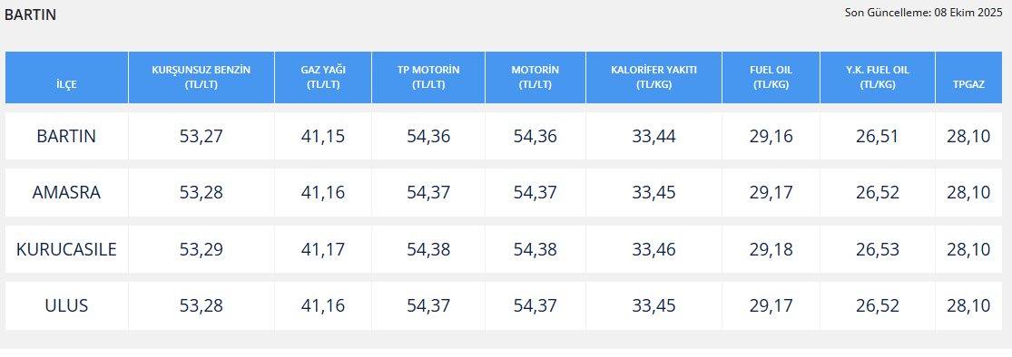 Yeni fiyatlarla birlikte Bartın’da akaryakıtın litre satış fiyatları şu şekilde belirlendi: