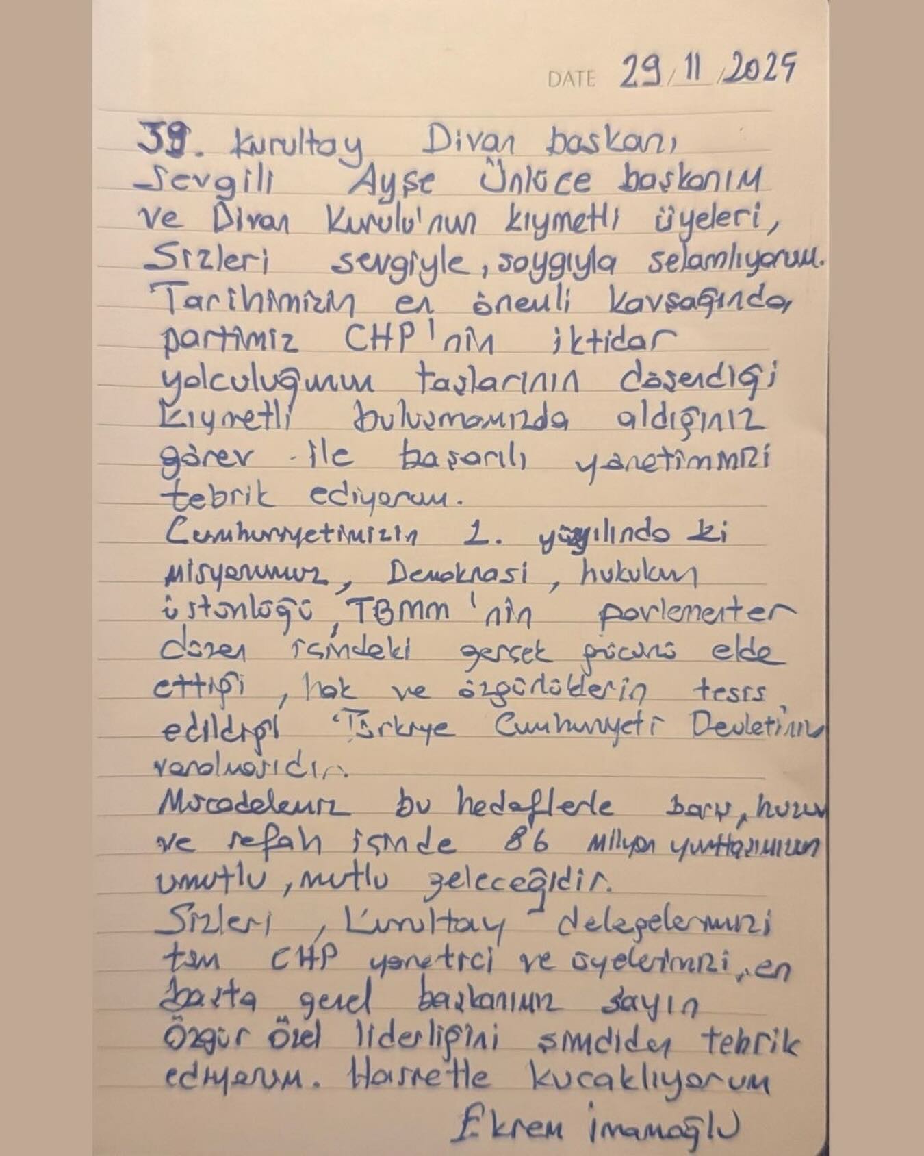 “Cumhurbaşkanı adayımız Sn. Ekrem İmamoğlu’nun 39. Olağan Kurultayımız da bizlere gönderdiği mektup, kendisinin Silivri zindanında siyasi tutsak olarak esir ediliyor olmasına rağmen bu duygu ve düşünceleri,Cumhuriyetimizin ikinci yüzyılında, demokrasimize, hukuk devletinin gerekliliklerine ve partimize yapılan her türlü baskı ve adaletsizliğe karşın umudumuza ve mücadele azmimize güç katmaya devam ediyor.