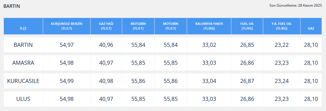 Fiyatlar, şehirler arası dağıtım maliyetleri ve bölgesel farklara göre değişmekle birlikte, indirimlerin pompaya yansıdığı belirtildi. İndirimin ardından Bartın’da akaryakıt tabelalarında fiyatlar şu şekilde:
