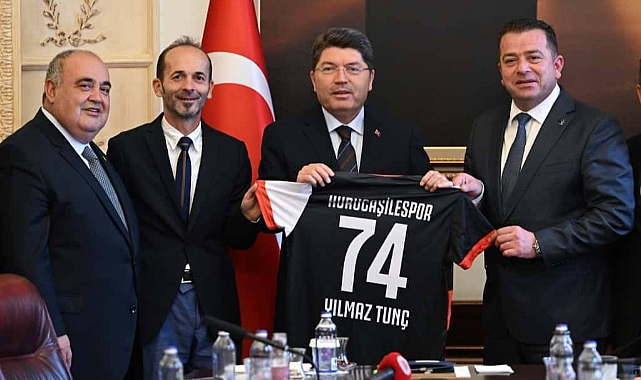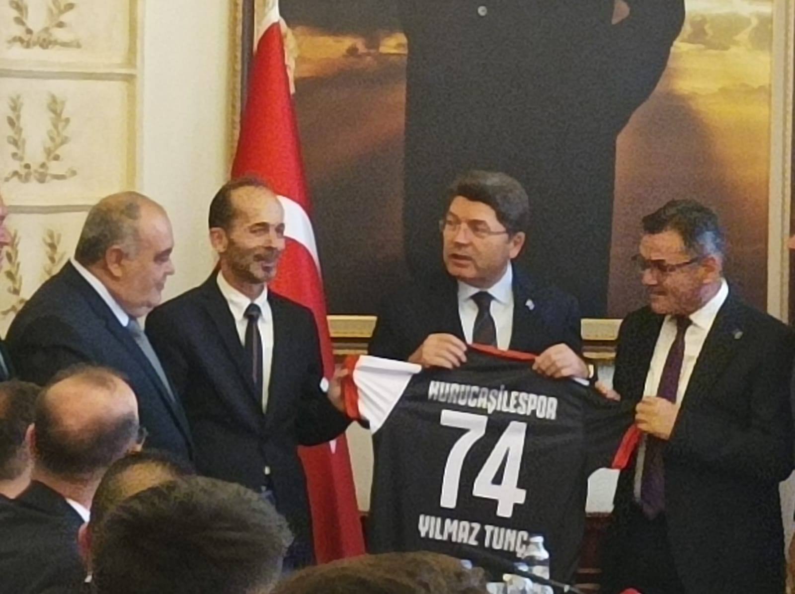Ak Parti Kurucaşile İlçe Başkanı Murat Erfındık ve Kurucaşile Belediye Meclis Üyesi ve Kurucaşilespor kuübünde yönetim kurulunda görev yapan Zafer Yavuzdemir, Adalet Bakanı Yılmaz Tunç'a Kurucaşilespor forması hediye etti.