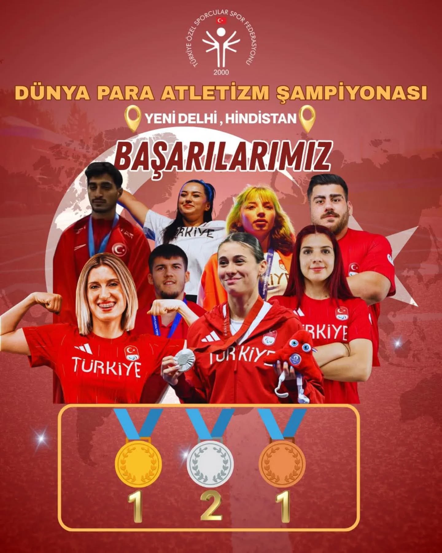Hindistan’ın Yeni Delhi kentinde 22 Eylül – 03 Ekim tarihleri arasında düzenlenen Dünya Para Atletizm Şampiyonası’nda Türkiye Özel Sporcular Spor Federasyonu Atletizm Milli Takımı büyük bir başarıya imza attı.