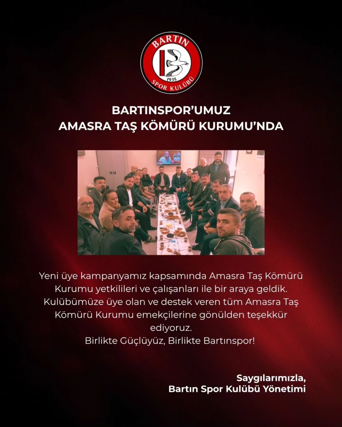 Bartınspor yeni Yönetimi BAL Ligi öncesi kulübe destek olmaları için Bartın halkını üye olmaya davet etmişti.Sezon başı " Üye Ol , Rozetini Al" slanoguyla başlatılan kampanya aylık 100 , yıllık ise 1200 TL olarak açıklanmıştı. Bartınspor yönetimi kuübe destek amacıyla başlatılan kampanya ya destek için önemli kurumları ziyaret etmeyi sürdürüyor. Bartınspor Kulü Başkanı Mehmet Maden yönetici Özcan Köseoğlu ve kulüp müdürü Şennur Berber ile birlikte Amasra Taş Kurumu yetkilileri ve çalışanları ile bir araya geldi. Kuküpten yapılan açıklamada;Yeni üye kampanyamız kapsamında Amasra Taş Kömürü Kurumu yetkilileri ve çalışanları ile bir araya geldik. Kulübümüze üye olan ve destek veren tüm Amasra Taş Kömürü Kurumu emekçilerine gönülden teşekkür ediyoruz. Birlikte Güçlüyüz, Birlikte Bartınsp