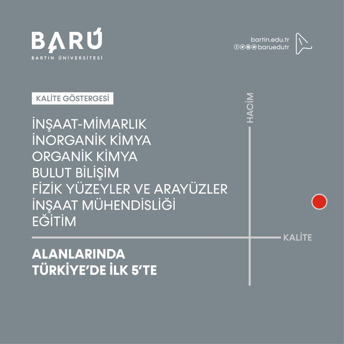 Alan bazlı karşılaştırmalardaki kalite göstergelerinde “İnşaat-Mimarlık” ve “İnorganik Kimya” alanlarında Türkiye’de birinci olan BARÜ, “Organik Kimya” ve “Bulut Bilişim” alanlarında üçüncü basamakta gösterildi. Ayrıca BARÜ, “Fizik Yüzeyler ve Arayüzler”, “İnşaat Mühendisliği” ve “Eğitim” alanlarında ise ilk beşte yer almayı başardı. “Akıllı Lojistik ve Bütünleşik Bölge Uygulamaları” alanında ihtisaslaşmaya hak kazanan BARÜ’nün öne çıktığı konuların “Bölgesel Odaklı” çalışma alanlarını kapsaması da dikkat çekti.