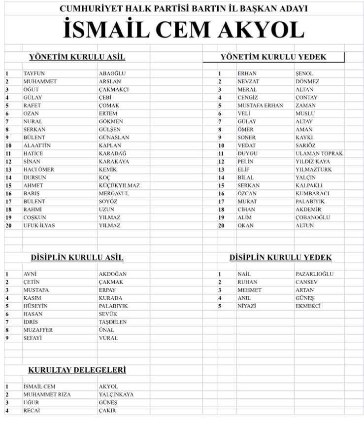 Cumhuriyet Halk Partisi (CHP) Bartın İl Başkanlığı’nın 39. Olağan Kongresi, Bartın Halk Eğitim Merkezi’nde yoğun katılımla gerçekleştirildi. Mevcut İl Başkanı İsmail Cem Akyol, kongreye tek aday olarak katıldığı seçimde yeniden il başkanlığına seçilerek güven tazeledi.Kongrede CHP’nin birlik ve dayanışma vurgusu öne çıkarken, partililer yeni döneme dair hedeflerini ve yol haritasını paylaştı. Başkan Akyol, konuşmasında Bartın’da partinin örgütlenme gücünü daha da artıracaklarını, yerel seçimlerde başarı çıtasını yükseltmeyi hedeflediklerini ifade etti.Kongrede yapılan oylamanın ardından CHP Bartın İl Başkanlığı’nın yeni yönetim kurulu şu isimlerden oluştu: