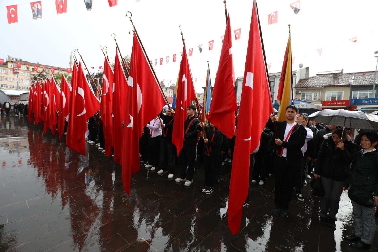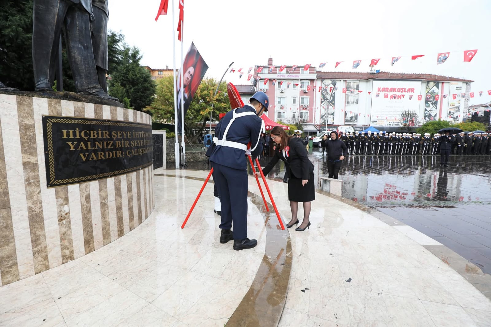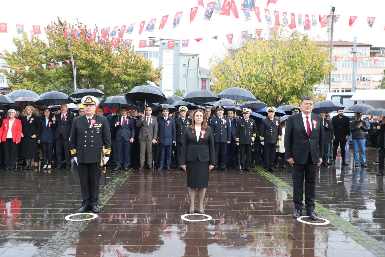 Törende, Vali Arslan, Garnizon Komutanı Sır ve Belediye Başkanı Yalçınkaya, Atatürk Anıtı’na çelenk sundu. Ardından katılımcılar, Cumhuriyetimizin kurucusu Gazi Mustafa Kemal Atatürk ve silah arkadaşları ile tüm şehitler için saygı duruşunda bulundu ve İstiklal Marşı hep birlikte okundu. Şanlı Türk Bayrağı, marş eşliğinde göndere çekildi.