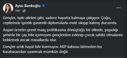 Cumhuriyet Halk Partisi (CHP) Bartın Milletvekili Aysu Bankoğlu yaptığı açıklamada, gençlerin artık sadece hayatta kalma mücadelesi verdiğini belirterek, iktidarın uyguladığı politikaların gençlerin geleceğini ellerinden aldığını ifade etti.