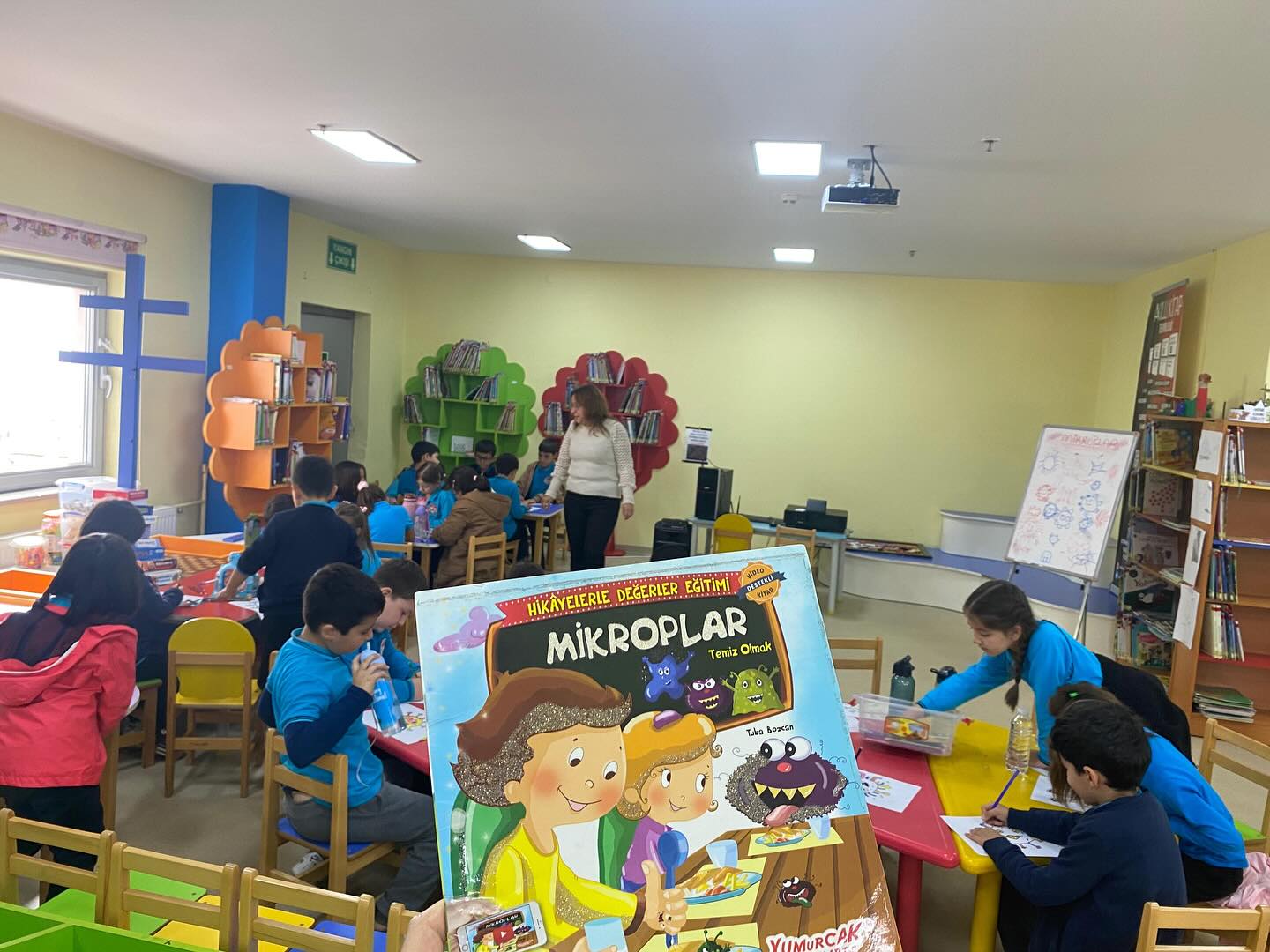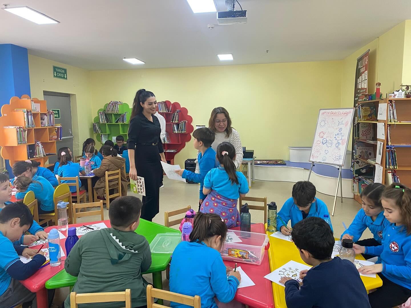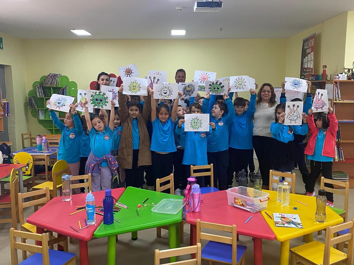 Kütüphane görevlilerinin rehberliğinde öğrenciler, zihninde canlandırdıkları mikropları yazı tahtasına çizerek kendi yorumlarını renklerle ifade ettiler. Ardından her çocuk, kendi “hayali mikrobunu” kâğıda resmedip boyadı. Ortaya çıkan renkli ve eğlenceli çizimler, hem yaratıcılığı hem de öğrenmeyi bir araya getirdi.