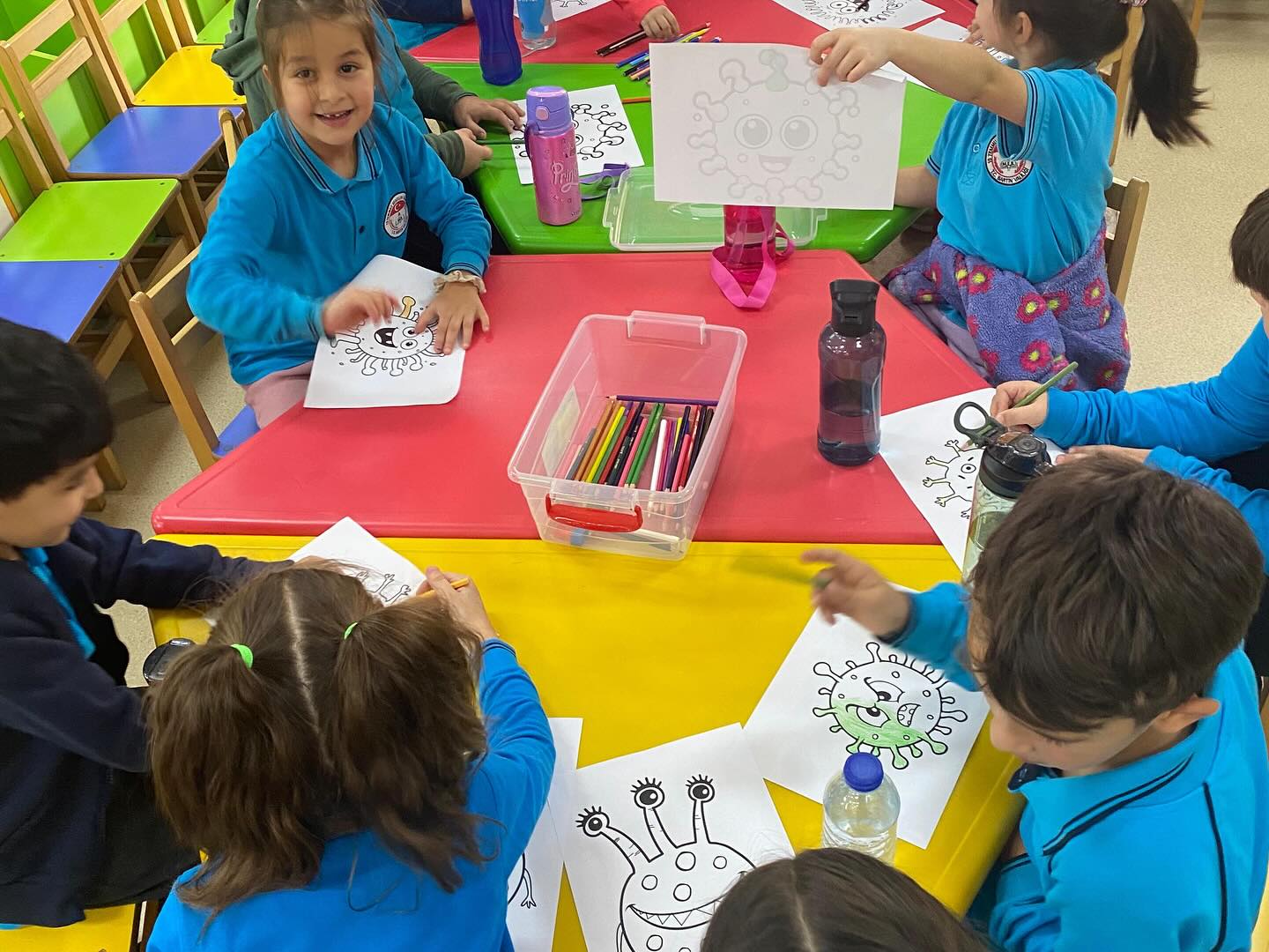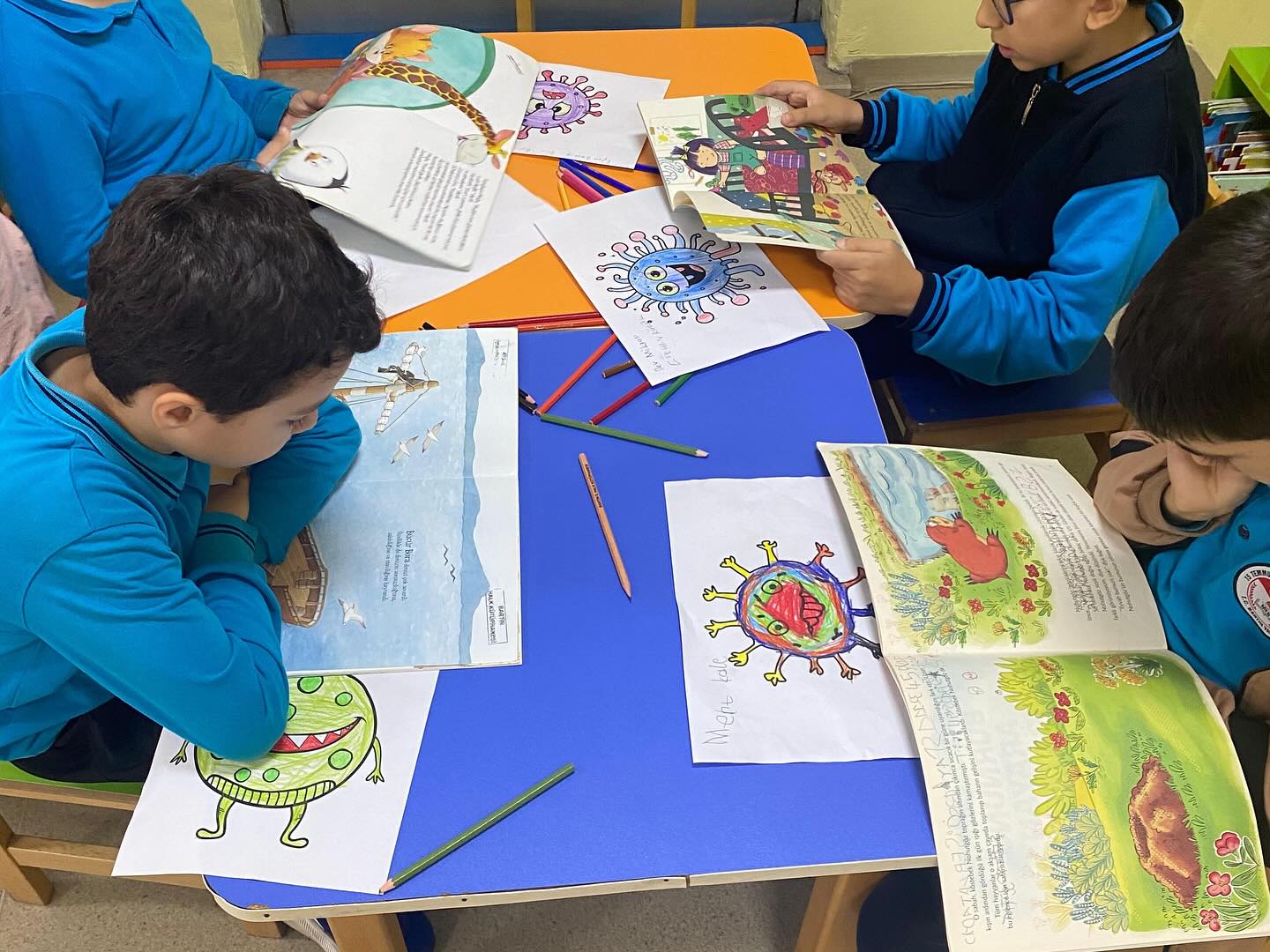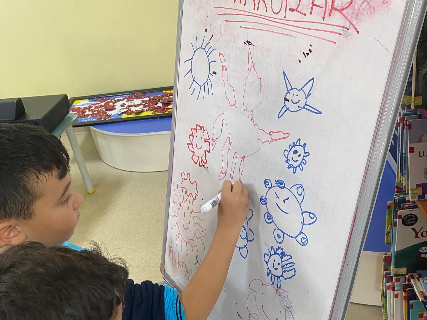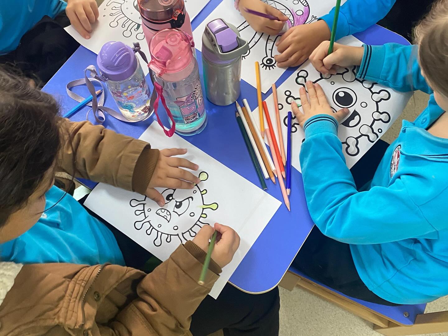 Kütüphane görevlilerinin rehberliğinde öğrenciler, zihninde canlandırdıkları mikropları yazı tahtasına çizerek kendi yorumlarını renklerle ifade ettiler. Ardından her çocuk, kendi “hayali mikrobunu” kâğıda resmedip boyadı. Ortaya çıkan renkli ve eğlenceli çizimler, hem yaratıcılığı hem de öğrenmeyi bir araya getirdi.