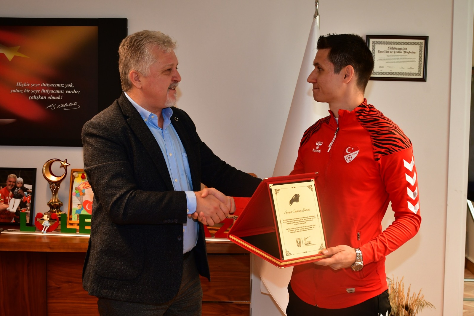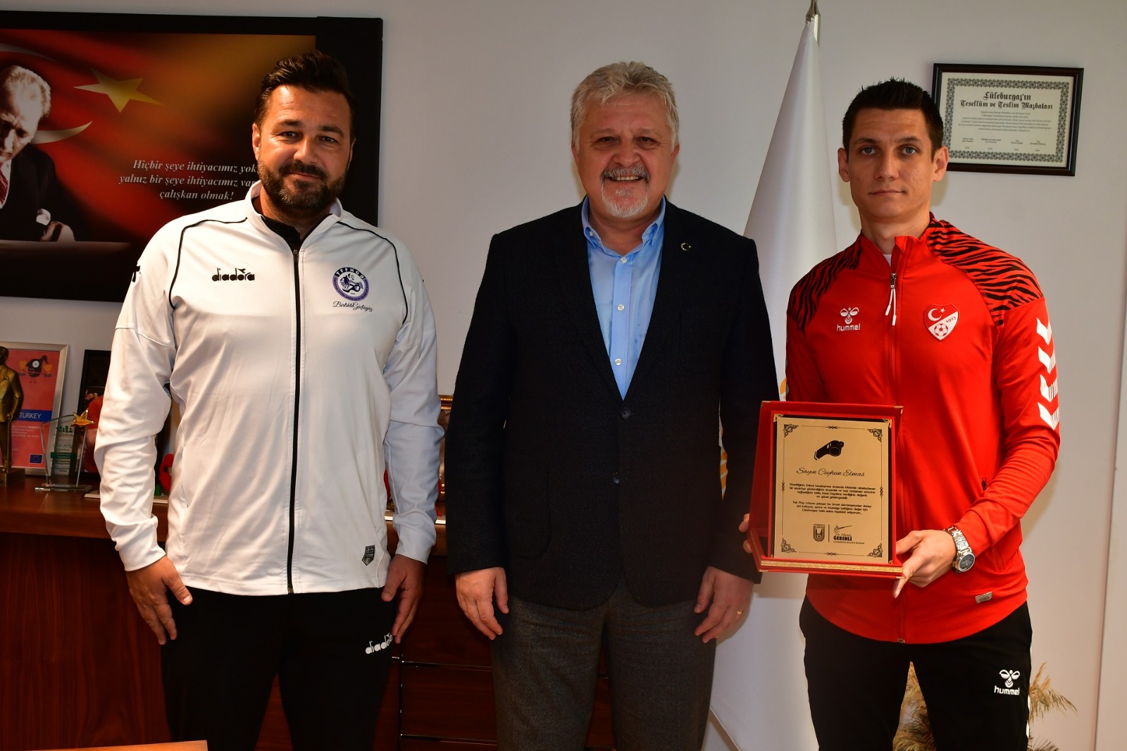 Verdiği kararla rahatsızlık geçiren bir taraftara erken müdahale yapılmasını sağlayarak tüm Türkiye’ye örnek olan hakem Ceyhun Elmas ve Türkiye Faal Futbol Hakemleri ve Gözlemcileri Derneği Kırklareli Şube Başkanı Oktay Erden, Lüleburgaz Belediye Başkanı Dr. Murat Gerenli’yi ziyaret etti.