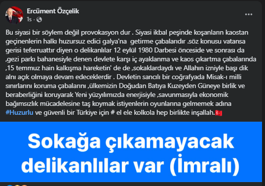 MHP Bartın İl Başkanı Ercüment Özçelik, sosyal medya hesabında yaptığı açıklamayla İmralı kararına ilişkin tartışmalara müdahil oldu. Özçelik, bir sosyal medya gönderisini alıntılayarak “provokasyon” vurgusu yaptı ve Türkiye’nin geçmiş siyasi olayları hatırlatarak şu ifadeleri kullandı: