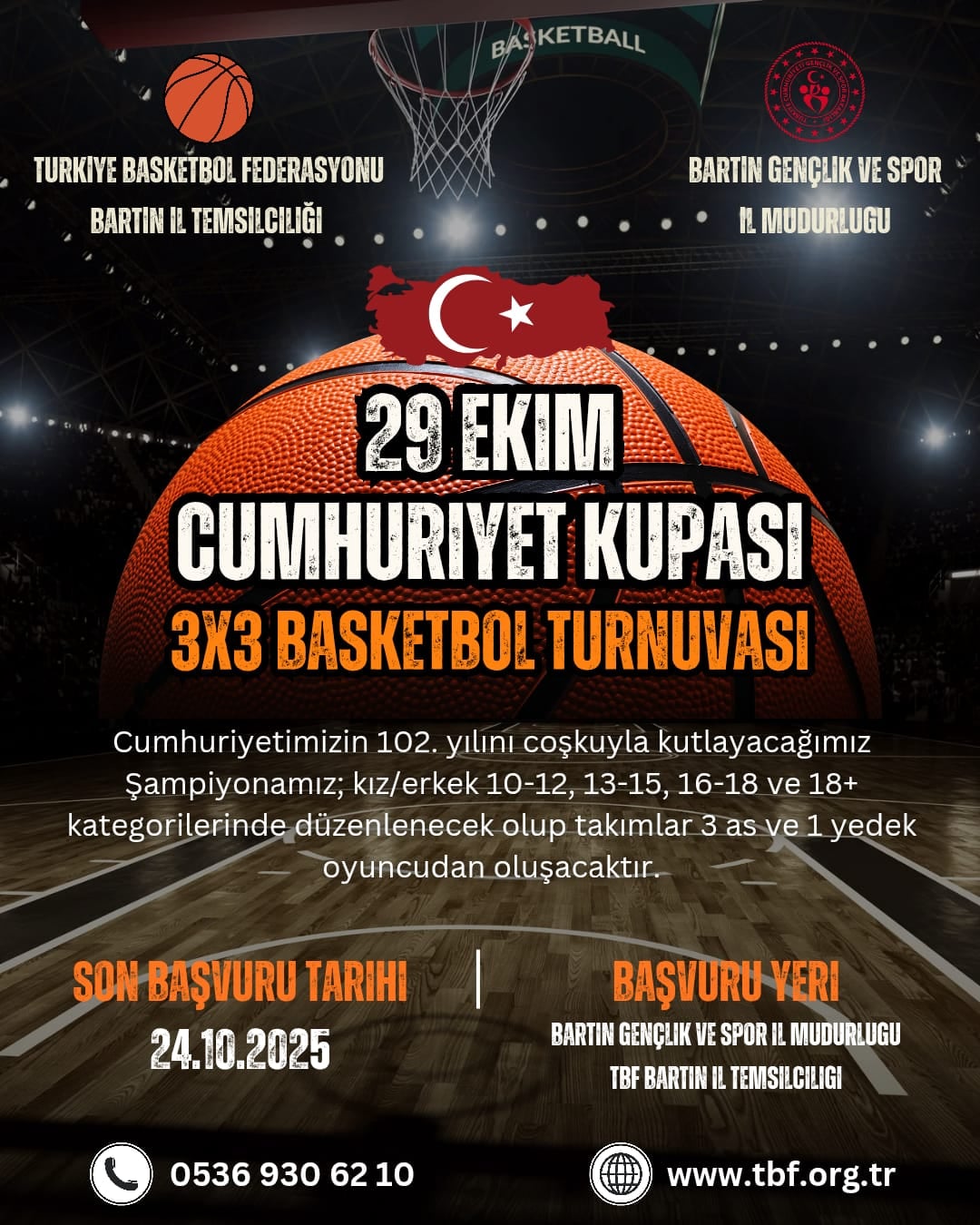 Bartın Gençlik ve Spor İl Müdürlüğü ile Türkiye Basketbol federasyonu 3x3 29 Ekim Cumhuriyet Bupası Basktbol turnuvası düzenliyor.