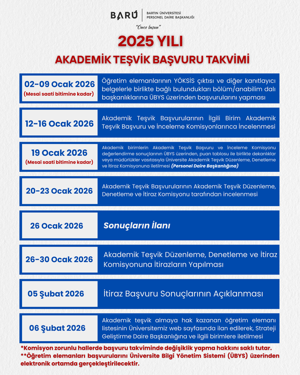 Bartın Üniversitesi, 2025 yılı Akademik Teşvik Ödeneği başvuru takvimini duyurdu. Üniversite bünyesindeki öğretim elemanları, “Akademik Teşvik Ödeneği Yönetmeliği” kapsamında başvurularını belirtilen tarihlerde yapabilecek. Başvurular, Personel Daire Başkanlığı tarafından yürütülecek ve ilgili komisyonlarca değerlendirilecek.Başvuru süreci, 2–9 Ocak 2026 tarihleri arasında, öğretim elemanlarının YÖKSİS çıktıları ve diğer kanıtlayıcı belgelerle birlikte bağlı oldukları bölüm veya anabilim dalı başkanlıklarına UBYS üzerinden başvurularını yapmaları ile başlayacak. Ardından 12–16 Ocak 2026 tarihleri arasında başvurular, Birim Akademik Teşvik Başvuru ve İnceleme Komisyonları tarafından değerlendirilecek.Birim komisyonlarının hazırladığı değerlendirme sonuçları, 19 Ocak 2026 tarihinde UBYS üzerinden üst birimlere iletilerek, Üniversite Akademik Teşvik Düzenleme, Denetleme ve İtiraz Komisyonu tarafından incelenecek. Üniversite komisyonunun değerlendirmesi 20–23 Ocak 2026 tarihlerinde tamamlanacak ve sonuçlar 26 Ocak 2026 tarihinde ilan edilecek.Öğretim elemanları, 26–30 Ocak 2026 tarihleri arasında itiraz başvurularını yapabilecek ve itiraz sonuçları 5 Şubat 2026 tarihinde açıklanacak. Akademik teşvik almaya hak kazanan öğretim elemanlarının listesi ise 6 Şubat 2026’da üniversitenin web sitesinde yayımlanacak ve ilgili birimlere bildirilecek.Üniversite, başvuruların doğru ve eksiksiz şekilde yapılabilmesi için öğretim elemanlarının belirtilen tarihlere titizlikle uymasını vurguluyor.